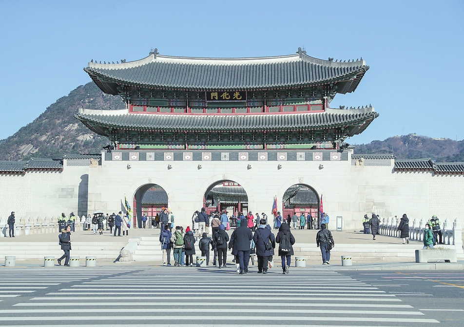 12月4日,游客在韩国首尔的光化门广场前游览。新华社记者 姚琪琳 摄