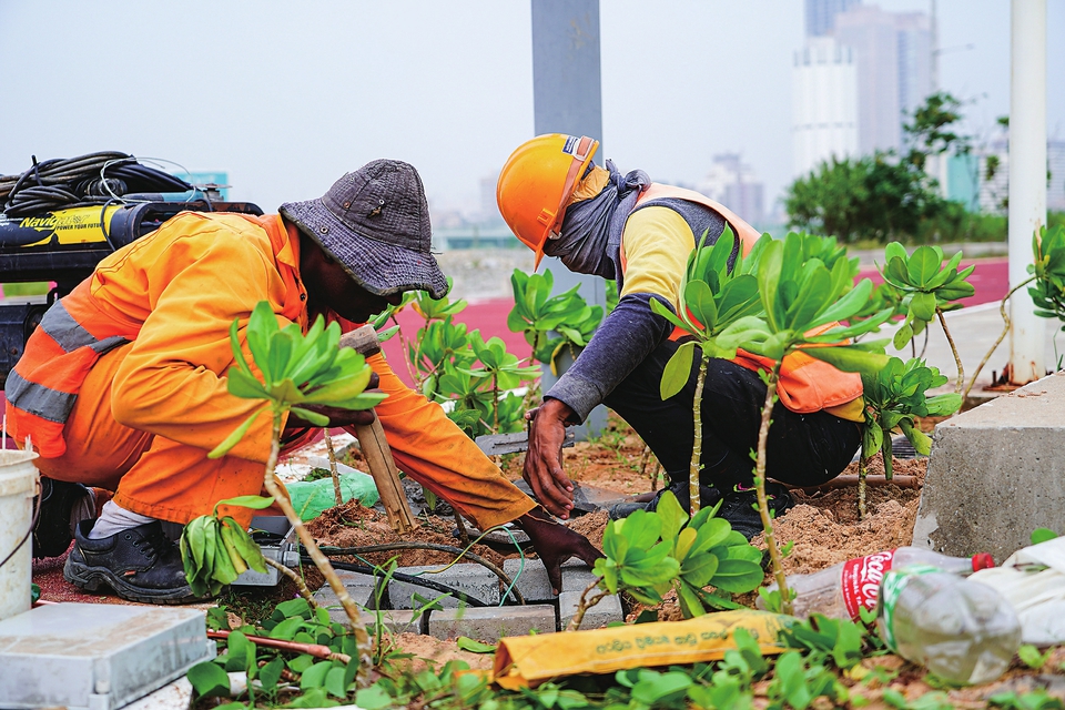 11 月 28日,工人在斯里兰卡科伦坡港口城进行绿化施工。新华社记者 陈冬书 摄