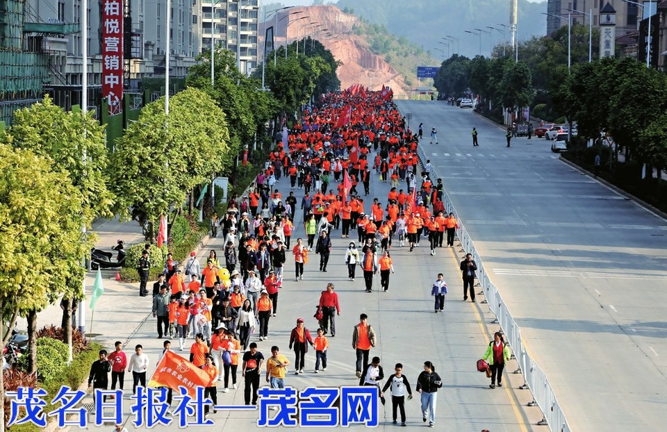 徒步大队走过育才大道。茂名日报社全媒体记者 李颜东 摄