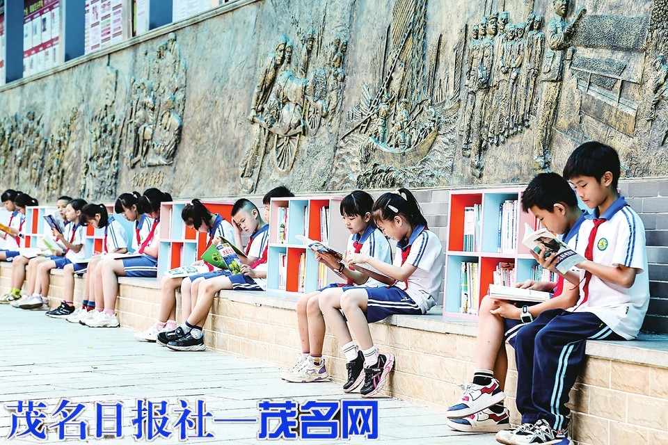 文东街小学党建文化长廊成为该校一道亮丽的红色风景线,也是孩子平时户外读书的场所。茂名日报社全媒体记者 岑稳 摄