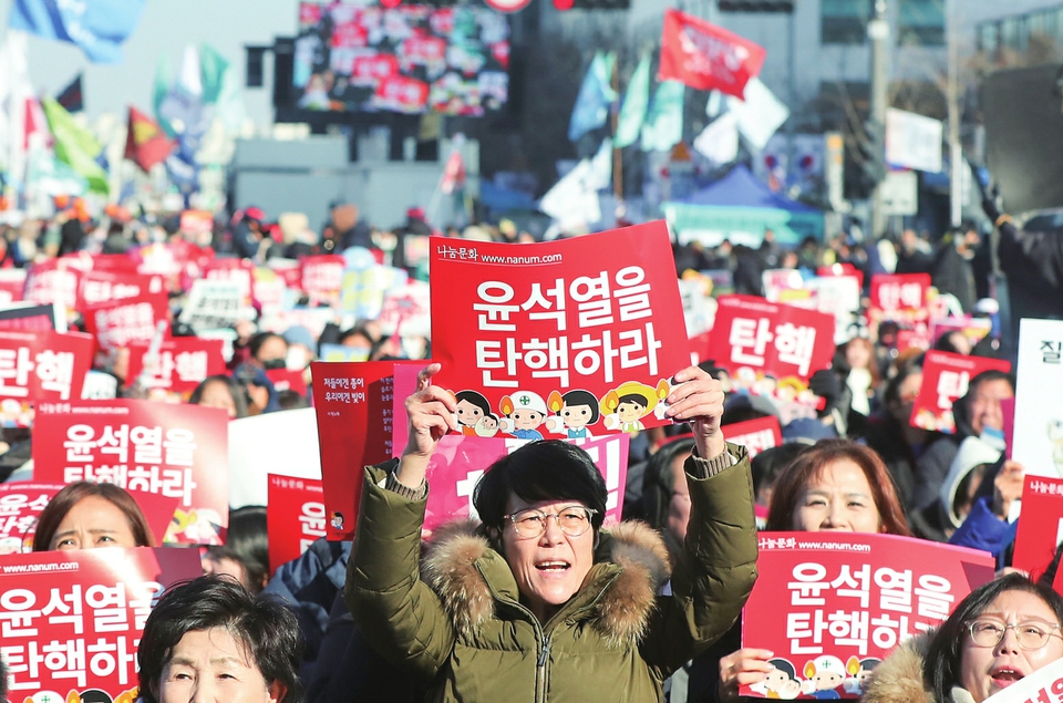 12月14日,在韩国首都首尔,人们在国会外参加要求弹劾总统尹锡悦的集会。新华社记者 姚琪琳 摄
