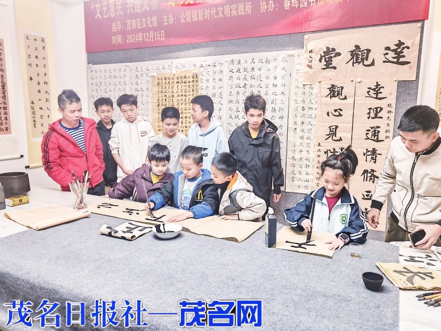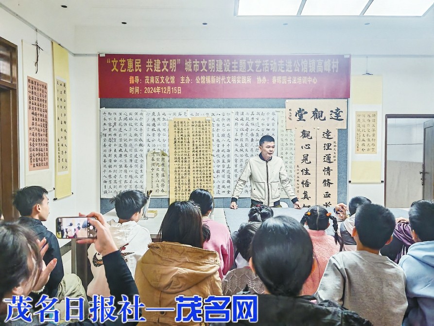 茂名晚报讯 昨日下午,由茂南区文化馆指导、公馆镇新时代文明实践所主办、春晖园书法培训中心协办的“文艺惠民共建文明”城市文明建设主题文艺活动走进公馆镇高峰村。现场开展书法交流,吸引了不少青少年书法爱好者参加。