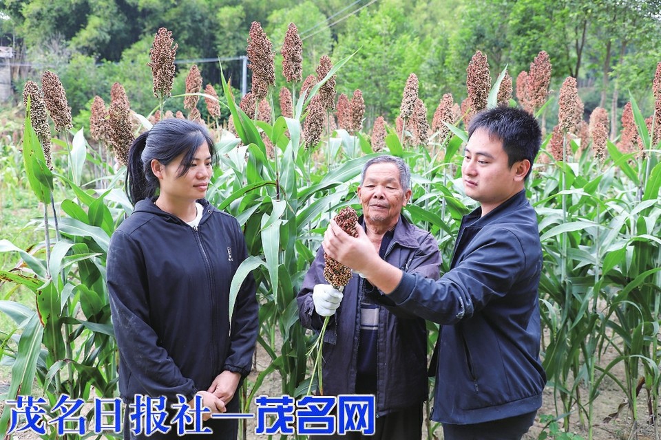 俊昌村创业青年梁锦荣也穿梭在村中的高粱地,准备着回收村民们种下的红高粱。据了解,梁锦荣家里是酿酒的,几年前他就开始创业,通过传承家庭产业,种植红高粱,打造高品质的酱香型高粱酒。这些红高粱都是他免费供种子给村民们种植的,并以每公斤3元的价格保价回收,高过保价则按市场价格回收,确保村民增收。
