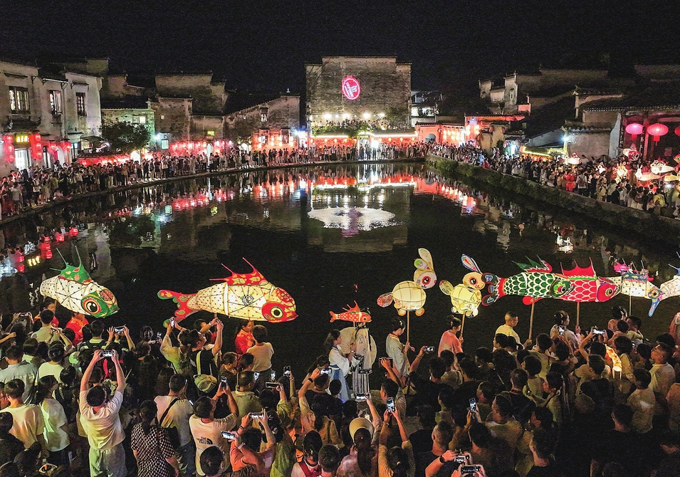 9月15日,花灯表演队伍在安徽省黄山市黟县宏村巡游(无人机照片)。“闹灯会”是安徽省黄山市黟县地区重要的节日传统民俗活动之一。2020年起,世界文化遗产地黟县宏村成立了传统花灯研学基地,逐步收集、整理和传授传统花灯的制作和表演技艺,将这项流传千余年的传统民俗技艺继续传承下去。