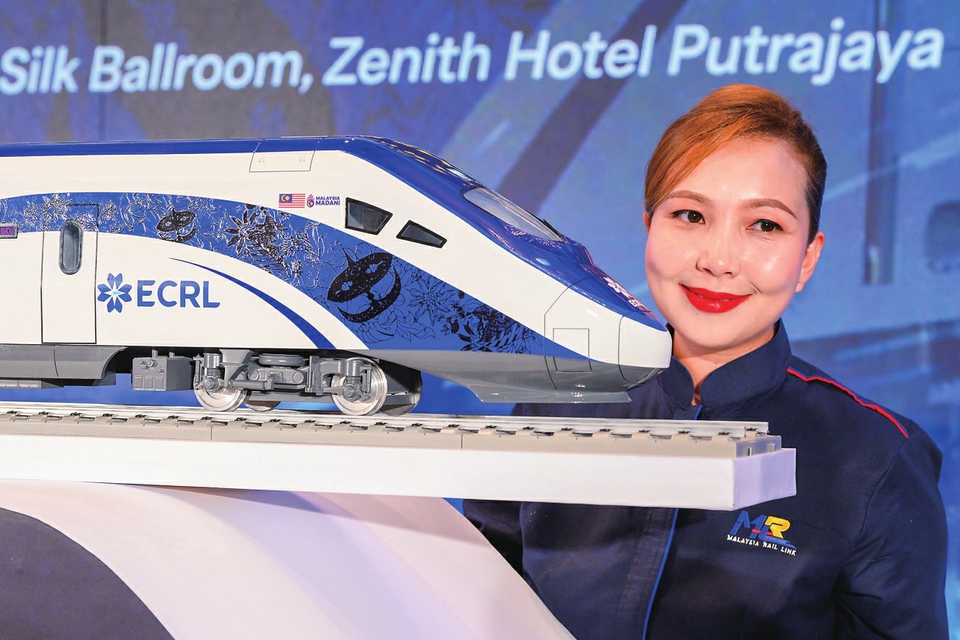 12月18日,在马来西亚普特拉贾亚,模特与新的动车组模型合影。新华社发(张纹综 摄)
