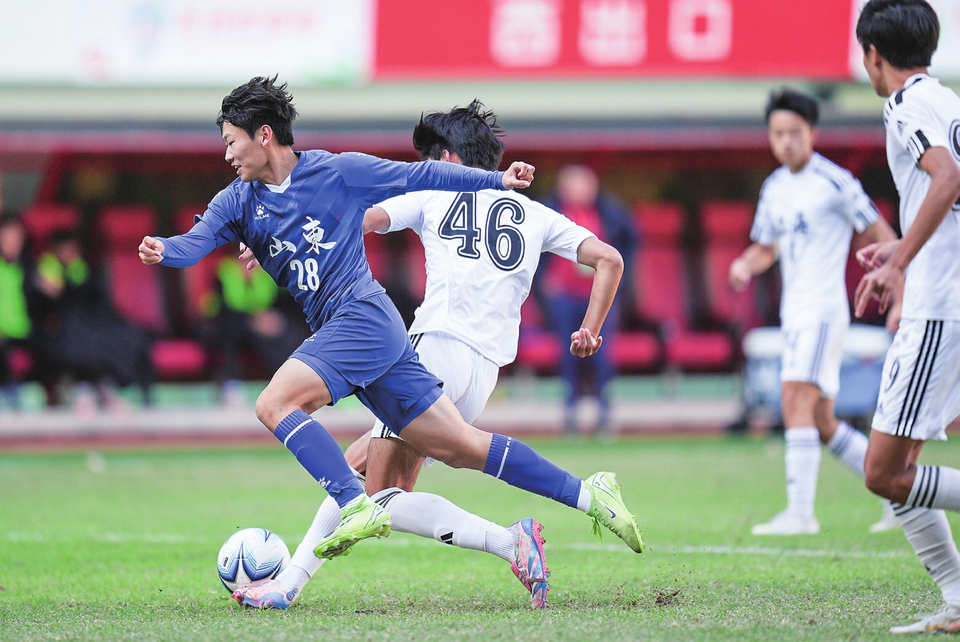 11月27日,山东队球员陈子涵(左一)在比赛中进攻。当日,在第一届青少年三大球运动会男足决赛中,山东队夺得冠军。新华社记者 薛宇舸摄
