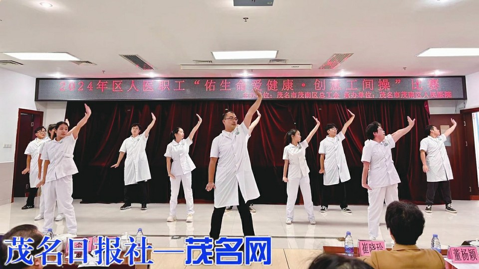 前日,由茂南区总工会主办、茂南区人民医院承办的“佑生命爱健康创意工间操”职工工间操比赛在区人民医院成功举办。茂南区人大常委会副主任、区总工会党组书记、主席崔晓玲,区人民医院院长董杨颖等领导出席活动并颁奖。图为冠军队伍比赛精彩瞬间。 茂名日报社全媒体记者梁翠萍通讯员李海燕摄