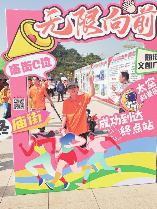 就在这样的环境下,我们只靠着半瓶水,翻过了一座座土丘,还踏过了一条小河,披荆斩棘,终于来到了终点!在潘茂名庙街,映入眼帘的是琳琅满目的小吃,人来人往的商店和各式各样的商品。我开心极了,并且在终点站打卡——勇者无惧,无限向前!