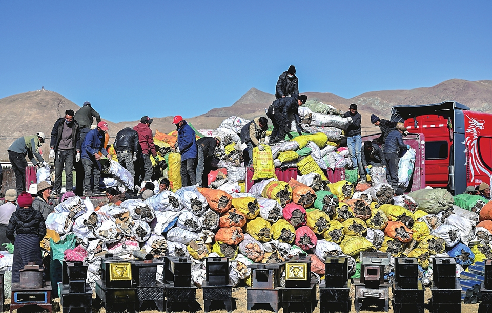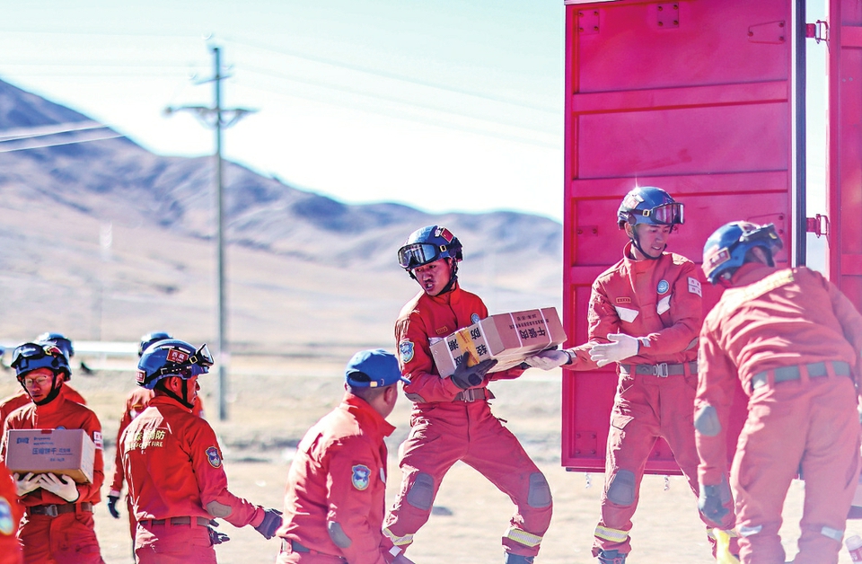 ▲1月9日,受灾群众在措布村卸载救灾物资。新华社记者 李响 摄