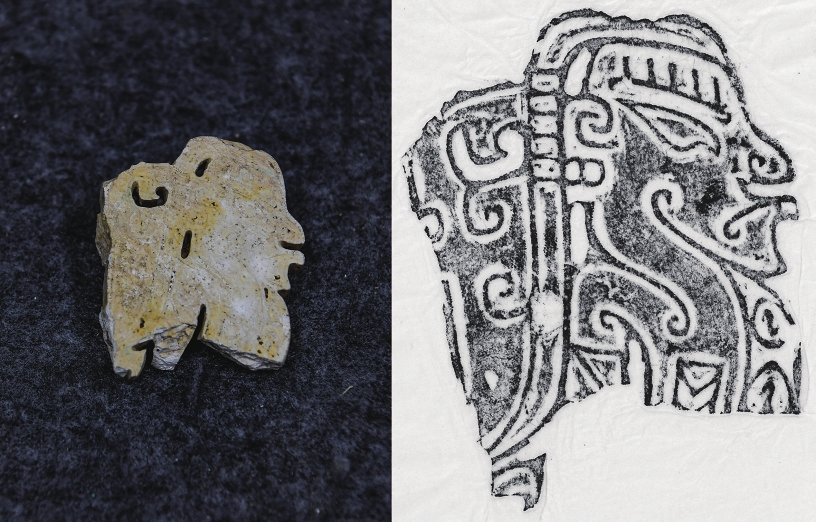 ▲这是一张拼版照片:左图为2024年7月10日在四川省文物考古研究院拍摄的三星堆遗址出土玉石上阳刻的侧身人像(新华社记者王曦摄);右图为玉石上阳刻的侧身人像拓片(新华社发,四川省文物考古研究院供图)。