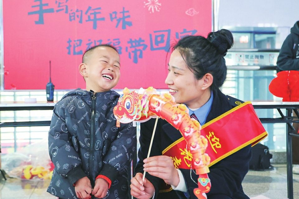 1月14日,福建永安南站迎春花服务台的工作人员与候车的小旅客互动。 新华社发(张海根 摄)
