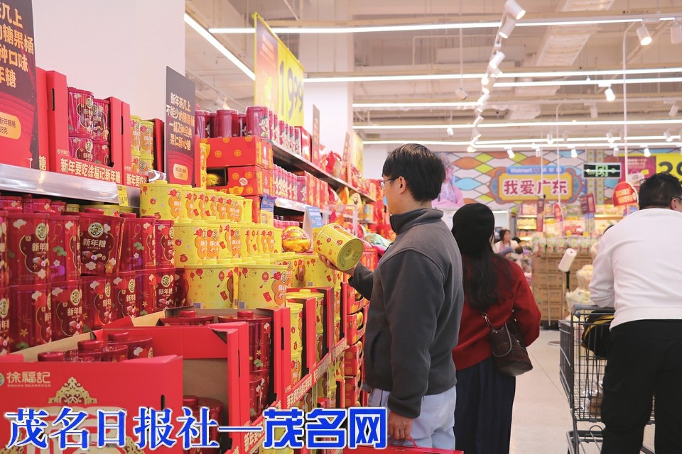 在沃尔玛茂名文化广场分店,记者看到,各种年货商品琳琅满目,摆放得整整齐齐。从传统的糖果、瓜子、花生,到新颖的进口零食、健康食品等,让人目不暇接。其中,在干果、糖果、饼干等区域,有较多的市民进行选购,他们推着购物车在货架间穿梭,仔细挑选着心仪的年货。工作人员显得格外忙碌,他们有的帮助顾客打包,有的忙着给顾客称重,还有的推着购物车及时补充货品,现场呈现出一派繁忙而有序的景象。记者留意到,正在选购干果的市民黄先生,他的购物车已经装满了各式各样的年货,显得年味十足。他告诉记者:“每年春节前,我都会来商超买些年货,今年也不例外。看着这些红彤彤的包装,就感觉新年的气氛越来越浓了。”