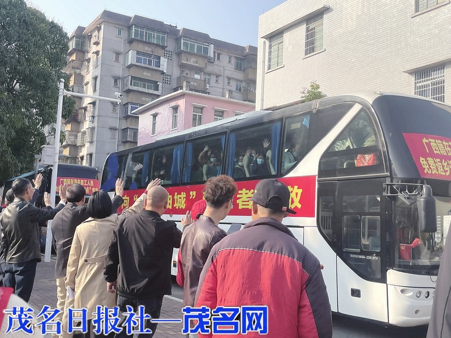 务工人员与欢送人员挥手道别。茂名晚报记者 李君平 摄