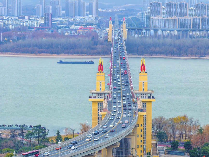 1月25日拍摄的南京长江大桥上的车流。新华社发(杨素平 摄)