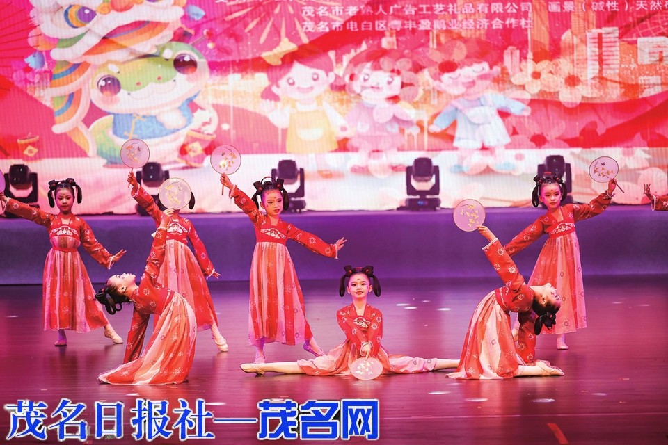 茂名晚报讯 在2025“好心茂名”少儿春晚中,创学教育机构带来了《唐韵灵儿》。孩子们身着华丽唐服,在台上翩翩起舞,舞步轻盈而优雅,随着节奏变换着队形,每一个转身、每一个跳跃都充满了童真与活力。