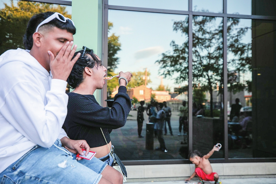 ?2023年8月17日,移民在美国伊利诺伊州芝加哥第9区警察局外吃饭。新华社发(文森特·约翰逊摄)