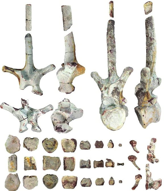 ▲四会赖氏龙类恐龙化石标本的背椎和尾椎。(受访者供图)