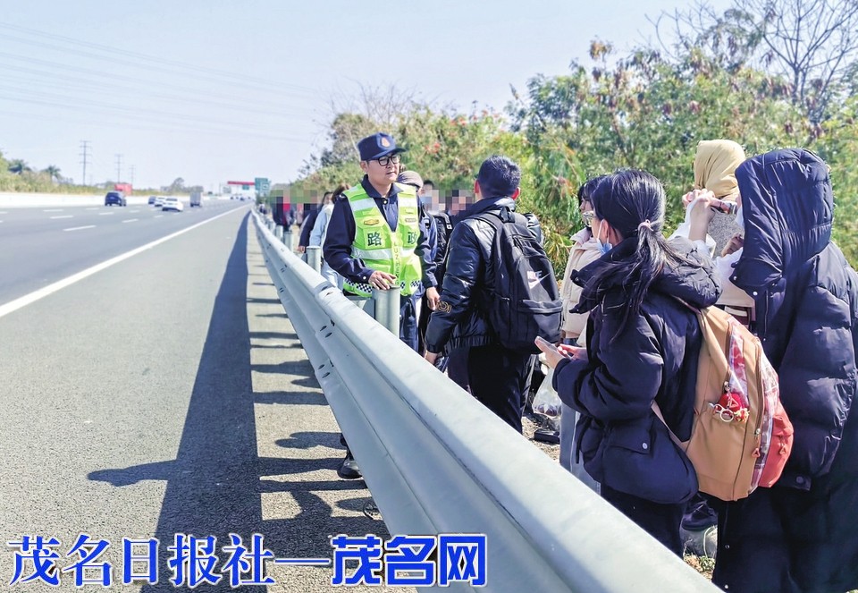 “茂湛高速往广州方向K3387+ 900M处有辆大客车出现故障,乘客也滞留路面,情况紧急……”2月9日11时44分许,茂名路政中队接到辖区高速交警通知,当班路政员林建宇、翁封剑立即赶赴现场,并联系高速养护、拯救队安排防撞车和救援车等前往现场支援。