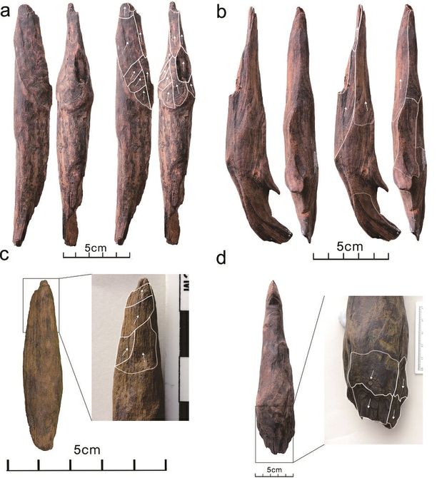 “研究发现,这些木器主要由松木制作,一些木器存在因修形削尖而留下的削刮痕,尖端存在因使用而产生的磨光条痕和断裂破损。这些痕迹出现在特定部位并具有方向性,是人类加工与使用的证据。”高星说。