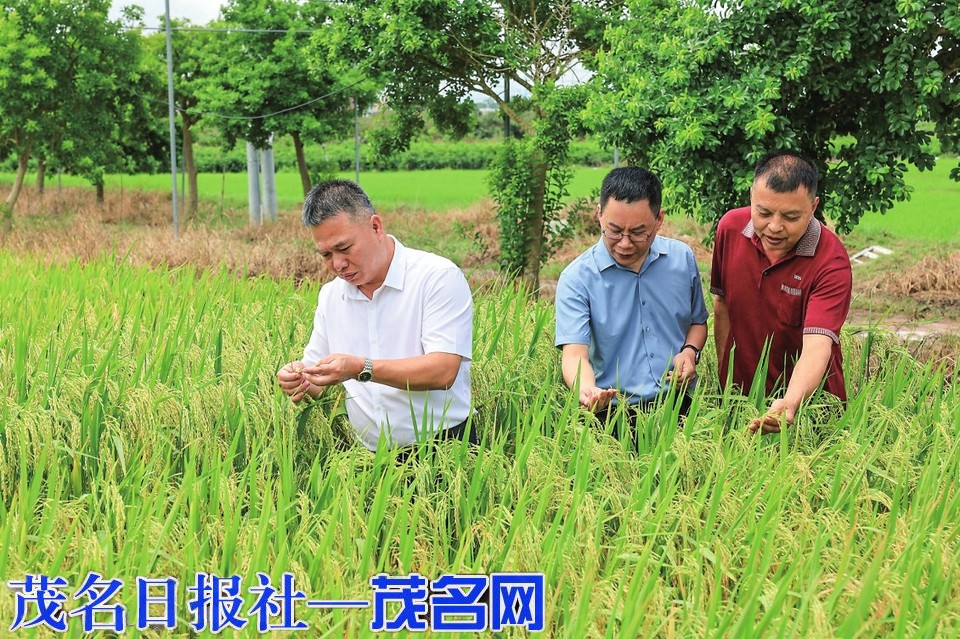 商会领导到田间查看杂交水稻生长情况。通讯员 黄林明 摄