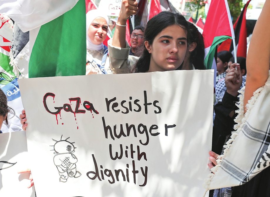 7月22日,巴勒斯坦民众在约旦河西岸城市纳布卢斯示威,抗议以色列对加沙实施的饥饿政策。新华社发(艾曼·诺巴尼摄)