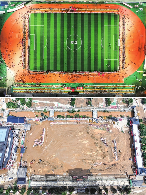 拼版照片:上图为7月25日在贵州榕江拍摄的灾后重建后的“村超”球场(无人机照片);下图为6月25日在贵州榕江拍摄的遭受洪水袭击的“村超”球场(无人机照片)。 新华社记者 杨文斌 摄