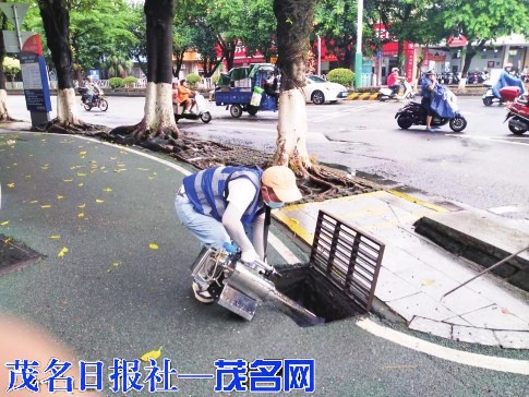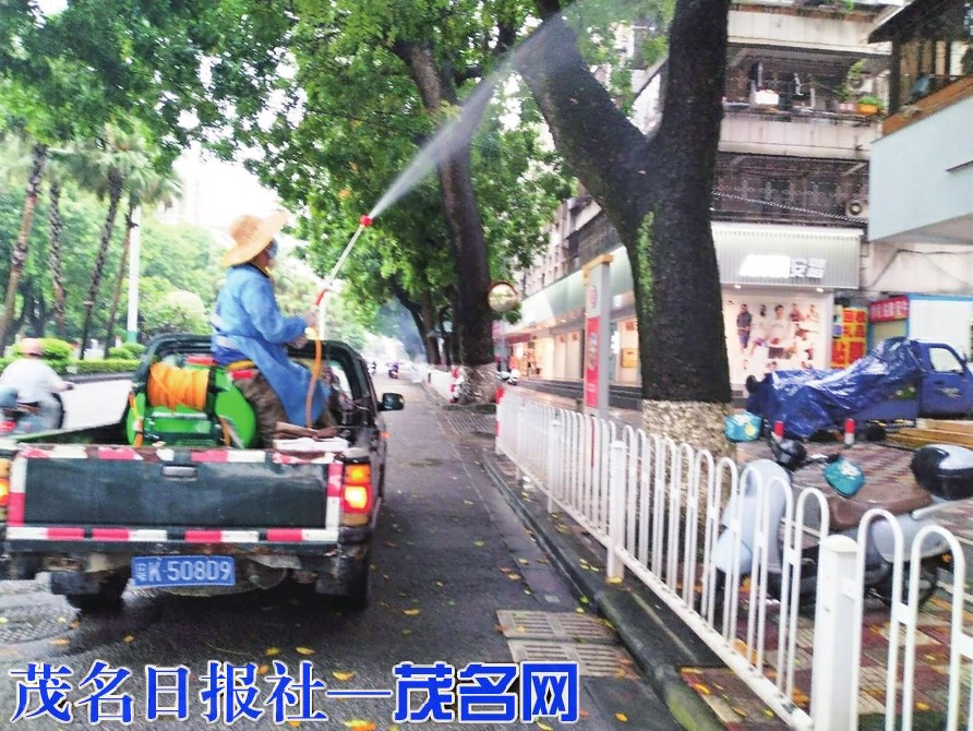 8月5日,专业灭蚊团队出动高效器械对市区油城三路的下水道,附近街道路树等易见蚊虫的地方进行药物喷洒,放置灭蚊药,清除积水,以阻断蚊虫滋生。茂名晚报记者 李光耀 通讯员 许铭兵 摄