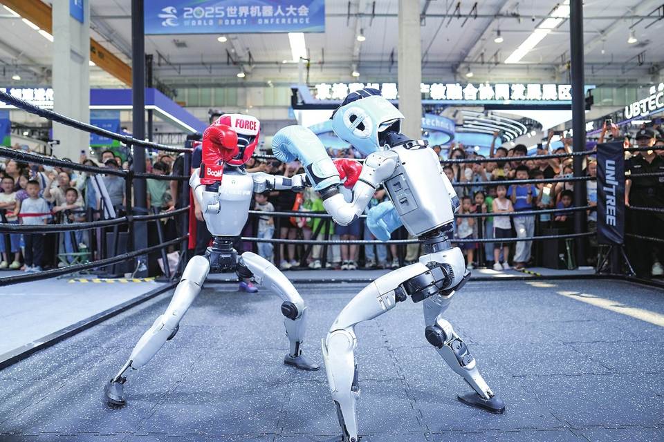 在2025世界机器人大会展馆内,观众在宇树机器人展台观看机器人拳击展示(8月11日摄)。新华社记者 鞠焕宗 摄