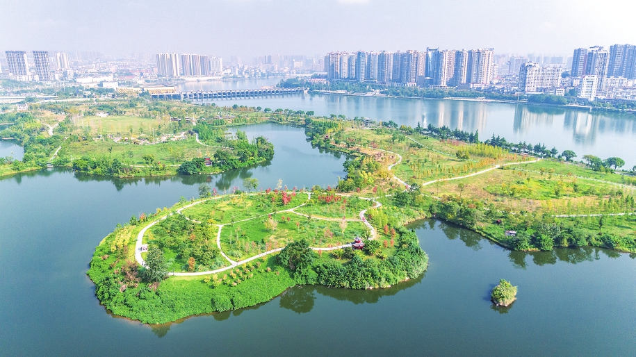 这是2024年9月27日拍摄的冷水滩区宋家洲生态公园(无人机照片)。 新华社发(雷中祥 摄)