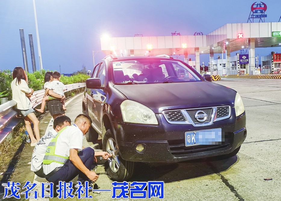 在茂湛高速浅水站,工作人员热心为司乘更换轮胎。