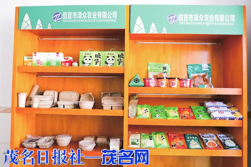 ▲展架上陈列着“以竹代塑”餐具、脆笋、酸笋等麻竹深加工产品。