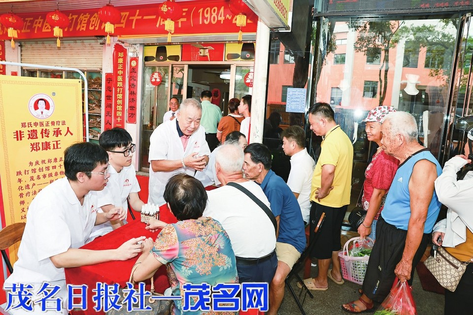 茂名晚报讯 记者陈琴 通讯员黄林明邱秋梅 为弘扬中医药文化,庆祝跌打馆创馆四十一周年,8月22日,茂名市级中医正骨非遗传承人郑康正在自家的跌打馆前开展义诊与赠药公益活动。活动现场锣鼓喧天,喜气洋洋,过往市民纷纷停下脚步,体验传统中医正骨疗法,并领取爱心医药用品。