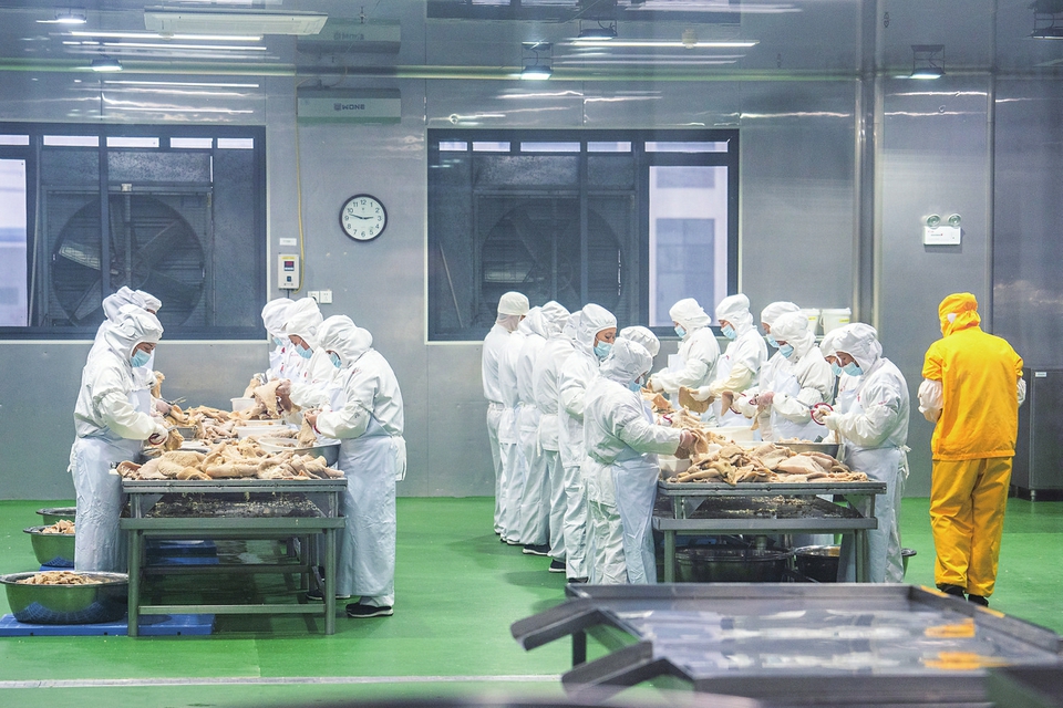 2024年11月24日,在湖南宁乡经开区一家预制菜企业生产车间,工作人员在处理食材。新华社记者 陈思汗 摄