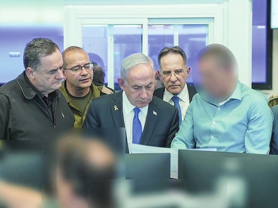 这张以色列国家安全总局(辛贝特)发布的照片显示,9月9日,以色列总理内塔尼亚胡(中)、以色列国防部长卡茨(左一)等在一处辛贝特指挥中心内交流。新华社发