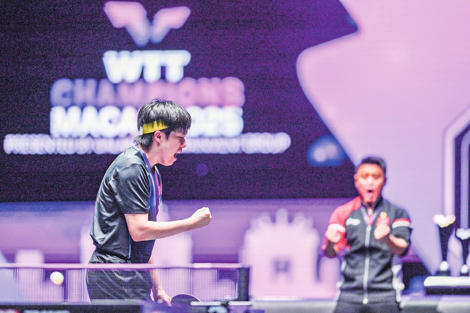 当日,在澳门进行的2025年世界乒乓球职业大联盟(WTT)澳门冠军赛男子单打决赛中,中国选手王楚钦4比0战胜巴西选手雨果·卡尔德拉诺,夺得冠军。新华社发(张金加 摄)