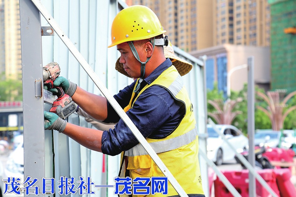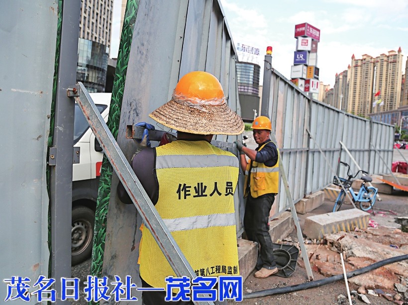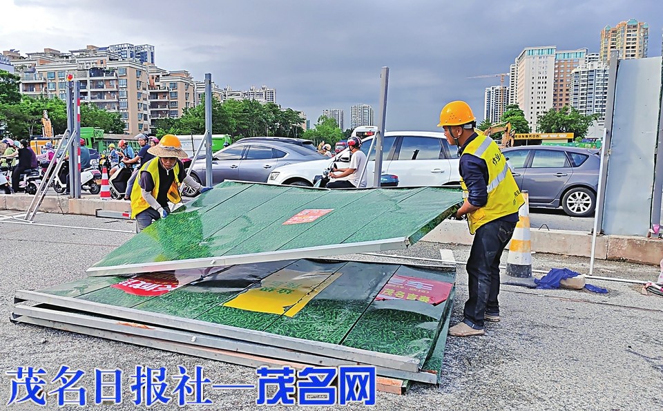 作业人员拆除临时施工围挡。茂名日报社全媒体记者 岑稳 摄