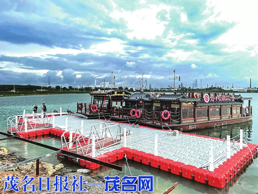 茂名露天矿生态公园好心湖观光游船服务即将投入运营。9月29日,记者在好心湖看到,三艘造型古朴的游船正在湖上调试运行,施工人员正加紧搭建乘船码头。预计游船可在国庆节投入使用。 茂名日报社全媒体记者 李颜东 摄