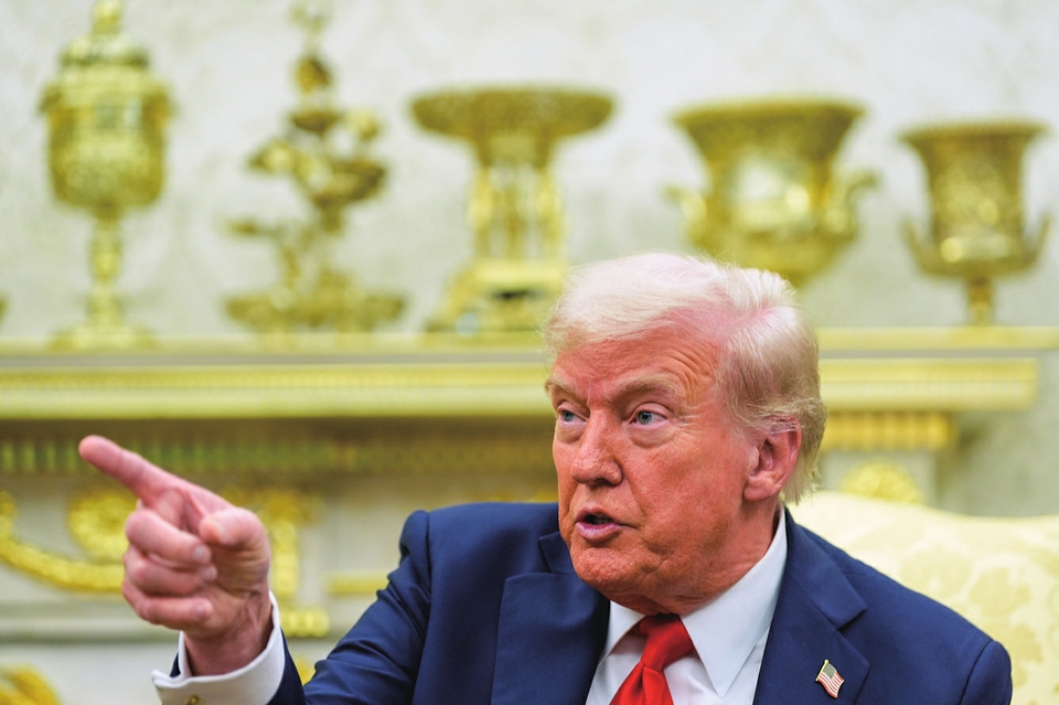 10月9日,美国总统特朗普在白宫椭圆形办公室与芬兰总统斯图布会见时,让记者提问。新华社/美联
