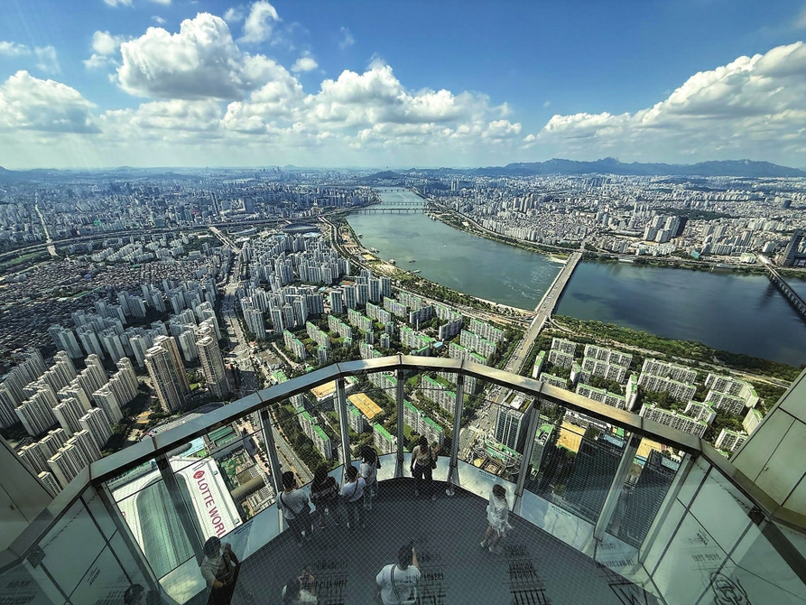 9月5日,游客在首尔的乐天世界塔高层展望台拍照。新华社发(全休相 摄)