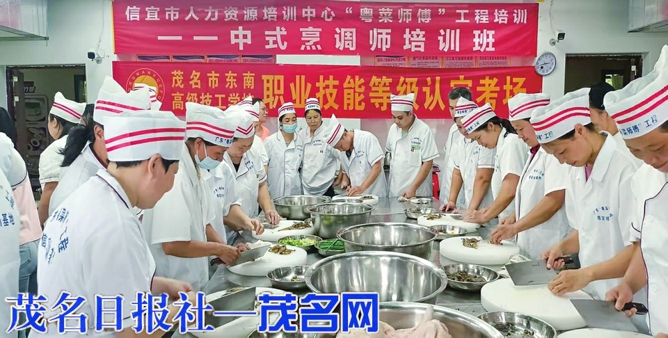 立足本地资源禀赋和产业特色,精心打造“粤菜师傅”技能培训品牌。信宜市人社局联合文广旅体局将研发的“李子菜、苦瓜菜、竹子菜”三大本地特色菜品系统融入培训课程,组织本土优质酒店培训教学、宣传推广。聚焦厨师班毕业生、残疾人等重点群体,联动市残联、职业学校等开展“粤菜师傅”技能培训,通过“理论+实操”“课堂+厨房”的培训模式,累计培训近800名学员,为传播高凉菜文化注入了“新生力”。同时,还联合该市教育局将工程成果延伸至校园餐饮领域,组织学校食堂人员开展专项培训,系统教授营养配餐、食品安全管控及本土特色菜肴制作等内容,推动校园餐食从“吃得饱”向“吃得好、吃得健康”转型升级。