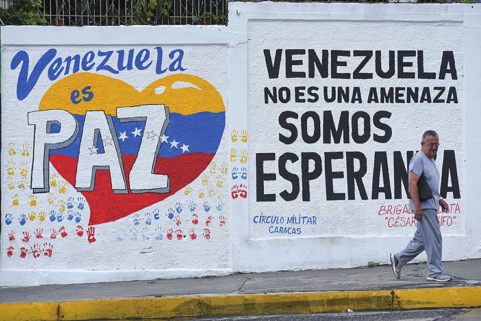 9月22日,在委内瑞拉首都加拉加斯,行人从街头的宣传标语前走过。标语上写着“委内瑞拉是和平国度”“委内瑞拉不是威胁,而是希望”。新华社发(马科斯·萨尔加多 摄)