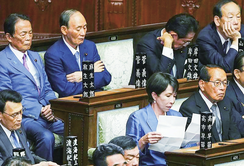 10月21日,在日本东京,自民党总裁高市早苗(前排右二)在临时国会众议院首相指名选举现场阅读文件。新华社记者 贾浩成 摄