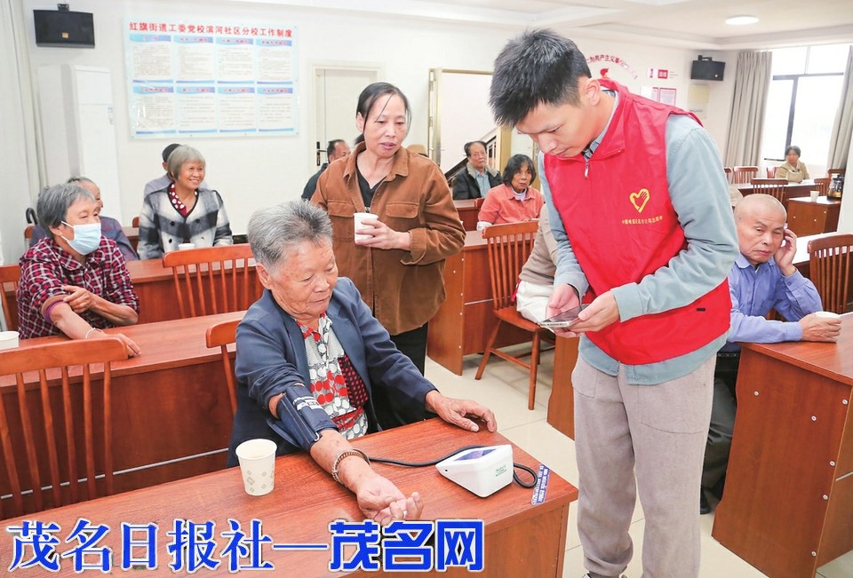 志愿者向老人讲解智能手机监测血压方法。茂名日报社全媒体记者 李颜东 摄