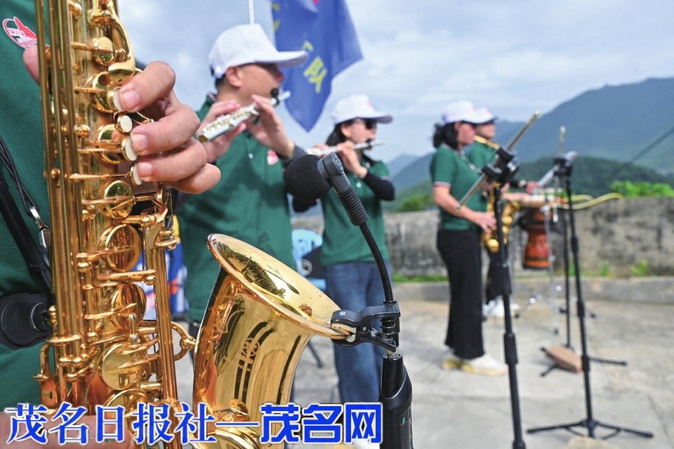 此外,登山沿线还进行了小型文艺演出,以乐声助力登高活动。在服务点二,茂名本土知名乐队“茂名中正乐队”用萨克斯、笛子、非洲鼓等多种乐器演奏动感歌曲,受到登高者的热赞。