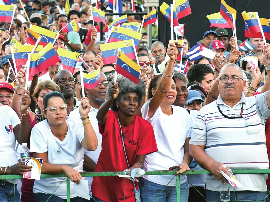 10月17日,在古巴首都哈瓦那,古巴民众挥舞旗帜参加集会,抗议美国军事威胁委内瑞拉,表达对委内瑞拉人民和政府的坚定支持。新华社发(华金·埃尔南德斯 摄)