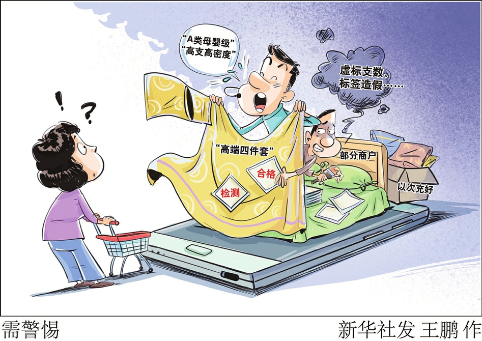 标签信息是假的,检测报告也是假的……近日“,新华视点”记者走访多地家纺市场发现,一些在售床上用品“高端四件套”存在以次充好等问题。