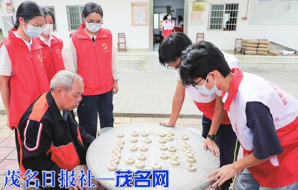 信宜中学志愿者与水口镇敬老院老人对弈象棋。通讯员 杨嘉丽 黄国通 供图