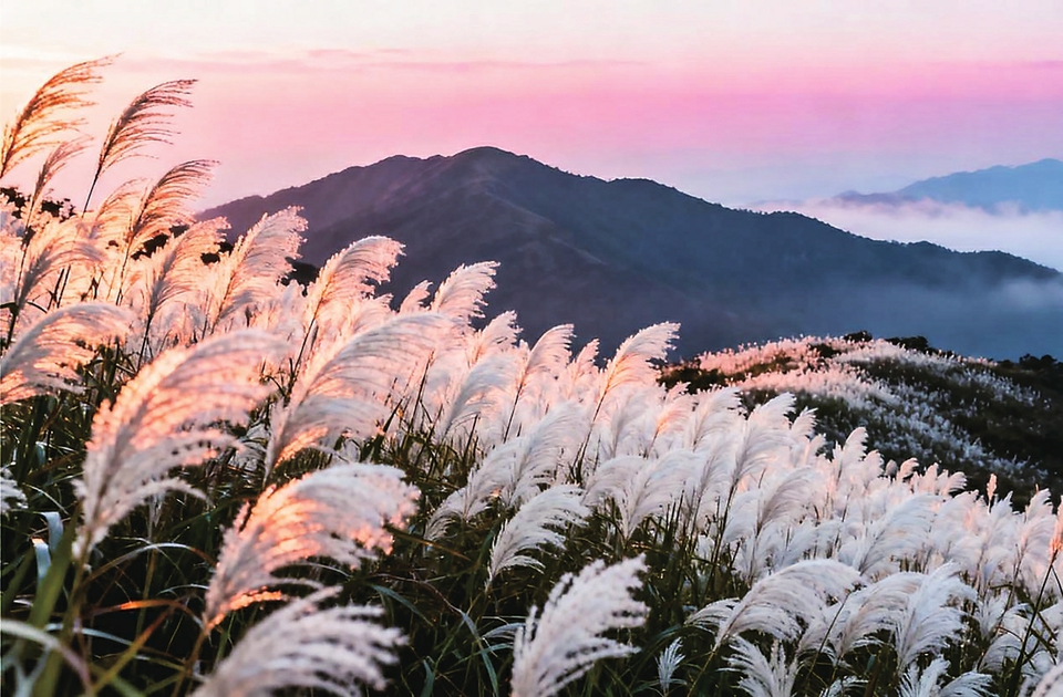 我随着人群走在蜿蜒的山路上,远处群山巍峨,山岚如纱,似烟似雾。九九重阳,秋意正浓,山上的芒草已经开花,成片的芒草被晨曦染成了柔软的金色。细长的叶片在风里舒展,顶端蓬松的花穗被染上了一层暖橙色的光。远看又似一层轻薄的积雪,覆在黛青的山轮廓上,像给山野披了件柔软的绒毯。凑近细看,每根花穗都带着细密的绒毛,沾着点滴晨露,在阳光照射下闪着晶亮的光芒,像藏了无数的小星星,更像是大自然为这个古老的节日所披上的盛装。