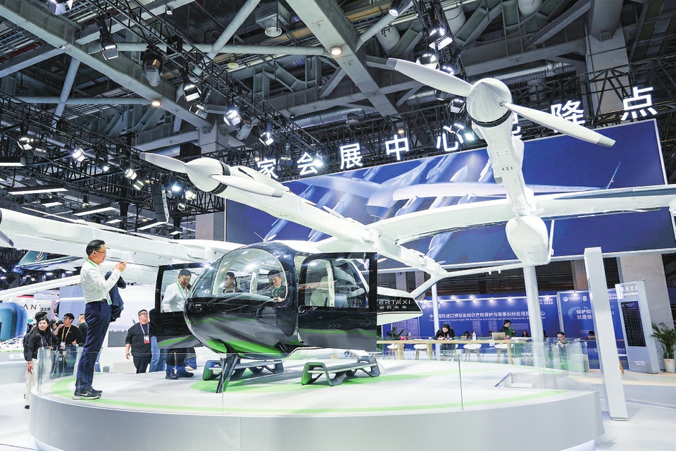 11月5日,人们在第八届进博会汽车及智慧出行展区御风未来展台观看、了解电动垂直起降飞行器。新华社记者 张子彧 摄