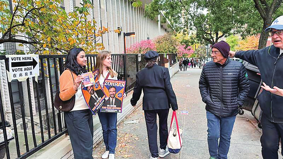 11月4日,支持者在美国纽约一个投票站外手持候选人祖赫兰·马姆达尼的竞选海报(手机拍摄)。新华社发(周焕新 摄)
